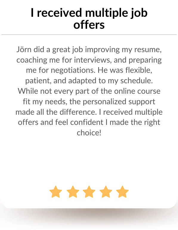 My name is Jörn Kobus. I’m a certified Trainer and Systemic Coach specializing in career development and a former Junior Associate Partner at McKinsey. With over a decade of experience, I’ve helped hundreds of professionals like you advance their careers and secure high-caliber roles. I know what it takes to stand out in a competitive job market, and I’m here to help you achieve your career goals.